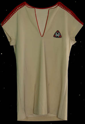 An off white lily shirt featured in Star Trek I: The Motion Picture. The costume is a shirt with a broken section running from shoulder to shoulder along the collar bone that is held together by red lace. The shirt is sleeveless and features an affixed engineering red backed Epsilon … |