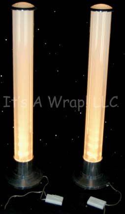 A pair of set dressings similar to those featured in Star Trek episodic television and movies. These items are tall, cylindrical lamps featuring a sturdy, metal base, a frosted lamp, a domed lid, and a long fluorescent inside. Both items have standard, American, type-A, power cords and slide-dial dimmer switches. … |