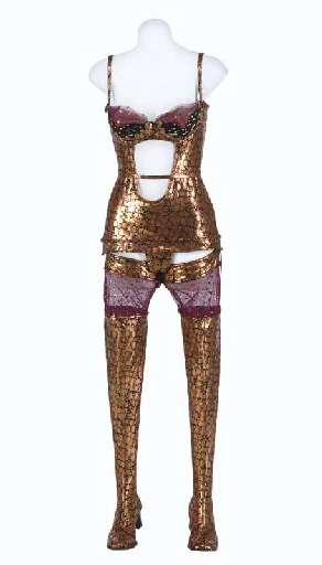 Two revealing women's costumes from "Rajiin", comprising: a red glitter top with garter belt, red/gold patent boots, and red sleevelets; and a copper and maroon mesh dress with sleevelets, g-string, and boots -- worn by Staci Anderson and Elizabeth DeCicco as Bazaar Girls in "Rajiin"in <I>Star Trek: Enterprise</I> (12) |