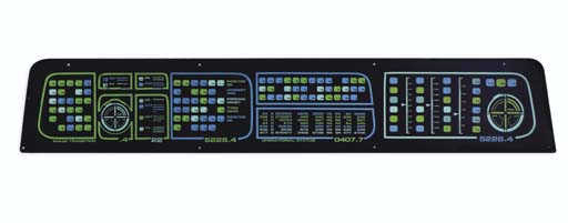 A prop starship control panel made from smoked acrylic plastic with a large-format Kodalith film with <I>Enterprise-A</I>-style Starfleet control graphics and hand-cut colored lighting gels and diffusion -- <I>96x24in.</I> -- control graphics indicate this was designed as a transporter control console |