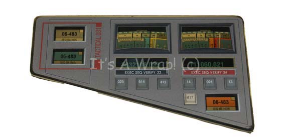 A piece of set dressing like those featured in the shuttle pod sets on various episodes of Star Trek: Enterprise. This item is a roughly triangular piece of smoked acrylic with beveled edges, a gray, graphical adhered to the front, rubber faux buttons with numerical values, and spaces cut out … |