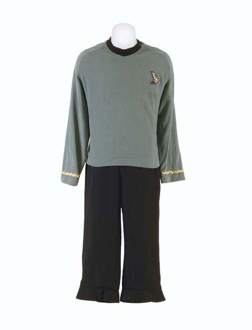 An <I>Original Series</I>-style men's Starfleet uniform, comprising: a blue fleece science/medical shirt trimmed at the cuff with a single row of gilt braid indicating rank of Lieutenant and a gold <I>Starship Defiant</I> insignia badge, with <I>Enterprise</I> label inside inscribed <I>Larry Krask</I>; and a pair of black cropped pants, with <I>Deep … |