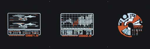Thirteen clear acrylic plastic panels applied with sections of backlit art -- <I>15x50in.</I> -- were used as simulated computer display screens behind the main workstation consoles on the <I>Starship Enterprise-A</I> Bridge set in <I> Star Trek VI: The Undiscovered Country</I> (13) |