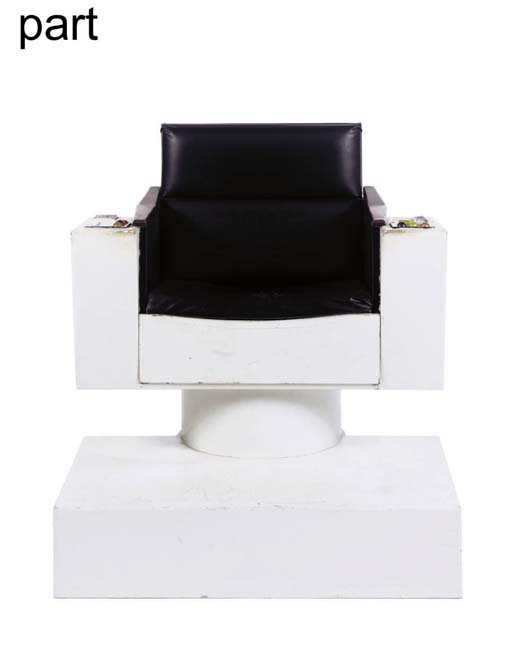 A replica of Captain James T. Kirk's chair from the <I>Star Trek: The Original Series</I>, the painted wood chair with pedestal and side consoles with simulated airship control buttons, with black vinyl seat -- <I>41x44x37in.</I> -- accompanied by a <I>48in.</I> segment of bridge railing with two unattached black uprights -- … |