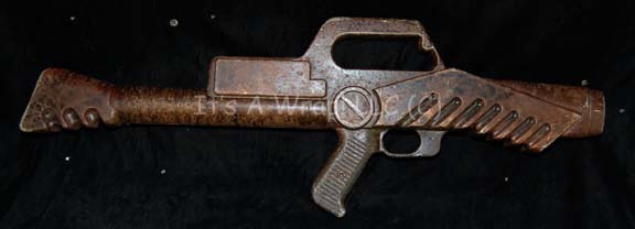 A prop energy carbine like those appearing in episodes of Star Trek: Enterprise. The item is a molded resin Suliban rifle that was converted for the episode “Shadows of P’Jem” to become a Coridan rifle. The item is painted mottled brown to for the character’s production design with light brushings … |