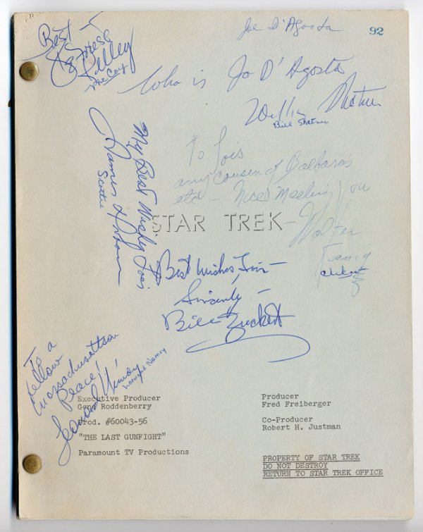 (NBC-TV, 1966-69) The script, for the episode "The Last Gunfight" (a.k.a. "Spectre of the Gun"), belonged to Star Trek casting director Joe D'Agosta who gave the script to his relative who was visiting the Paramount lot in May, 1968 where she met the cast of Star Trek, Mission: Impossible and … |