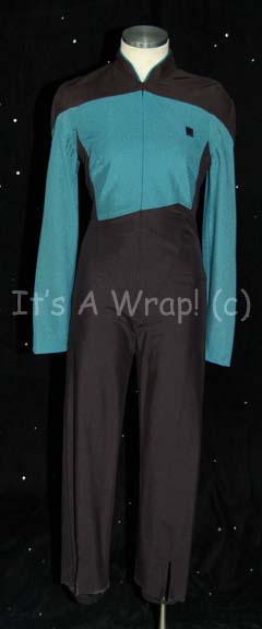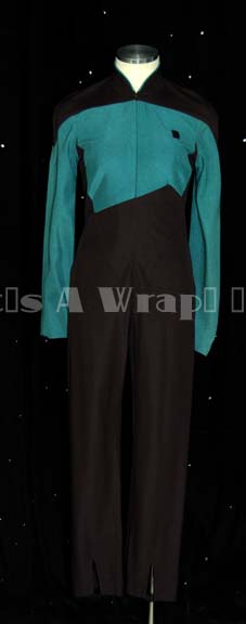A costume featured in various episodes of Star Trek: The Next Generation. This costume is a TNG-style Starfleet uniform jumpsuit featuring black shoulders, a Sciences Blue chest, back, sleeves, and piping around the Mandarin collar; a black waist and legs that end in stirrups. This particular uniform has zips that … |
