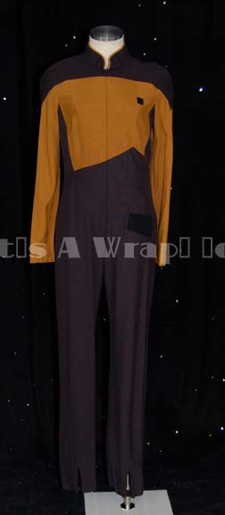 A costume featured in various episodes of Star Trek: The Next Generation. This costume is a Starfleet uniform jumpsuit and features black shoulders with an Operations Gold chest, back, sleeves, and as piping around the Mandarin collar; black waist and legs that end in stirrups, a zip down the front, … |