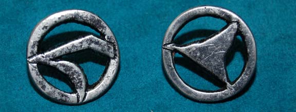 A lot of two molded metal costume accessories appearing on Klingon warrior uniforms in Star Trek episodic television and feature films. The items are disks with molded in wire backs which appear on the gorget collars of Klingon uniforms. Klingon iconographic lettering is centered inside the rings of the items. … |
