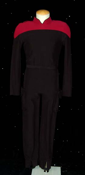 A costume featured in Star Trek: The Next Generation episodes like “The First Duty” and possible use in the later Voyager episode “Flesh and Blood”. This costume is a Starfleet cadet uniform consisting of a long-sleeved, full-length, black jumpsuit featuring red shoulders, black piping around the Mandarin collar, a Velcro … |