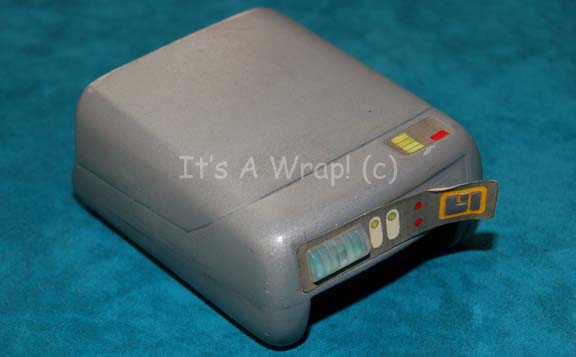 A prop medical tricorder molded into a non-deployed position made from solid foam for episodes of Star Trek: The Next Generation. The item is painted gray with a black inset for an un-accompanying hand sensor, and features a multi-colored graphical application across the top with metallic copper accents and blue … |