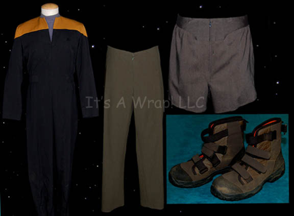 A lot of costumes and costume items featured in various episode of Star Trek: Voyager like “Worst Case Scenario”. This lot consists of the Operations Gold uniform worn by Robert Duncan McNeill in the aforementioned episode, a long-sleeved, full-length black jumpsuit featuring Operations Gold division colors around the shoulders, hoops … |