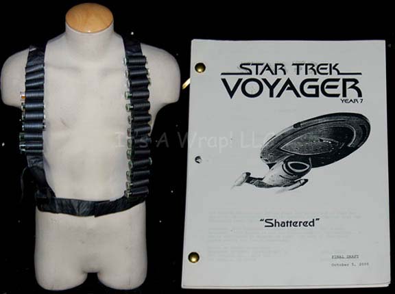 A group of prop items featured in the Star Trek: Voyager episode “Shattered”; wherein a temporal distortion shatters “Voyager” into numerous other timeframes where only “Commander Chakotay” (Robert Beltran) can move between. This item is one of the custom made bandoliers that held the chroniton-infused serum along with several vials … |