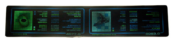 A pair of smoked acrylic panels with a translucent applications depicting ‘Sickbay Sys' and ‘Patient Records Sys’ with numeric values and graphics on the longer of the two and another item of similar design depicting ‘Starfleet Medical’ with similar numeric values made for Star Trek VII: Generations scenes taking place … |