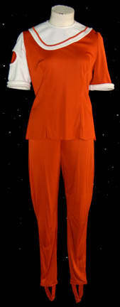 A costume featured in Star Trek II: The Wrath of Khan for wear by a female Regula I researcher. The costume is brown trousers with a matching top that features a white sleeve and white accent around the collar and dried special effects ‘blood stains' spattered on the white sleeve. … |