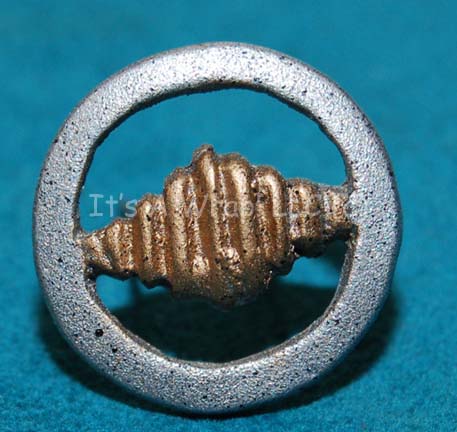 A molded resin rank accent for costumes appearing in various Star Trek feature films. The item is a small circle painted metallic silver and a gold painted diamond center piece. The item features metal wire glued to the reverse for attachment to a costume division strip and rank placements and … |