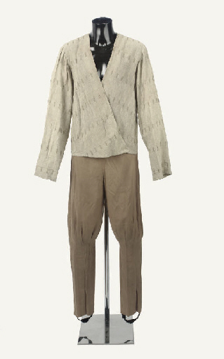 A long-sleeved shirt of beige textured linen, with a pair of brown trousers -- worn by Patrick Stewart as Captain Picard at the notorious Risa resort sequence in Captain's Holiday, label inside indicates subsequent use by other actors; accompanied by three corresponding colour photographs (5) |