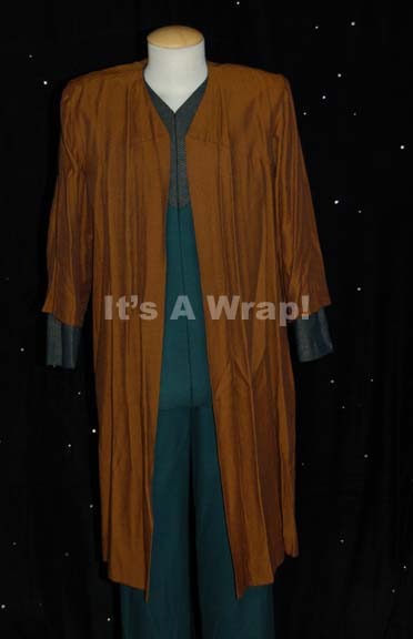 These three beautiful shoulder drapes were worn by Ventaxian guards in the Star Trek: The Next Generation episode “Devil's Due”. One drape is green with a gold chevron pattern design over its entirety, the next is maroon with a gold interlacing pattern and the last is burnt sienna with a … |