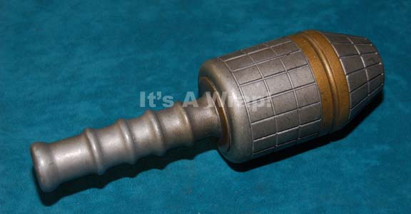 A prop grenade appearing in the Star Trek: Enterprise episode “Dessert Crossing” on the weapons rack of “Zobral” (Clancy Brown). The item is molded resin with a hand grip and lined details meant to represent a fragmentation feature to its supposed detonation. The item is painted metallic gold and silver … |