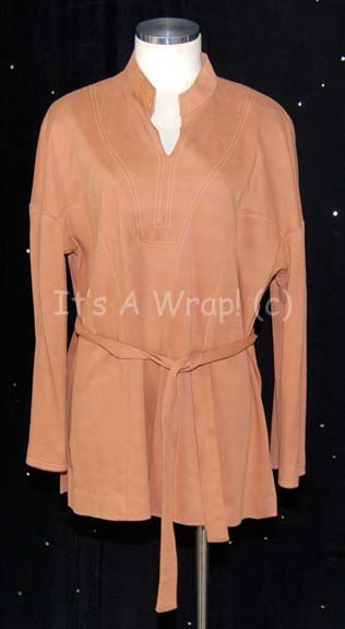A costume shirt featured in the first Star Trek feature film. This item is a tan, Class-B, Starfleet uniform top with long sleeves, white-stitched accents and a sash-like belt. A sewn in Paramount tag reads merely ‘42’. |