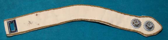 A Starfleet officer’s division strip like those appearing in Star Trek feature films. The item is a white fabric strip with gold border trim and a metal reinforcement. The white color indicates the wearer to be a member of the command division. The item retains the remains of thread at … |