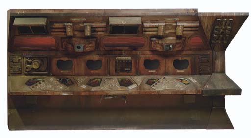 A full-scale prop space ship wall made of particle board and plywood built as structural beams and other hardware, painted in the Klingon style as aged, distressed metal -- <I>165x85x40in.</I> -- built for the Klingon bird-of-prey ship in <I>Star Trek V: The Final Frontier</I>, and featured in numerous subsequent Klingon … |