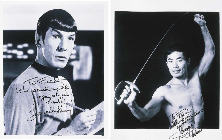 A pair of signed and inscribed photographs, 8 x 10 in. black and white, production stills from the original series. 1. TAKEI, George. Ensign Sulu inscribes to makeup guru Phillips, "To Fred With fond appreciation George Takei". 2. NIMOY, Leonard. "To Fred who saved my life again & again - … |