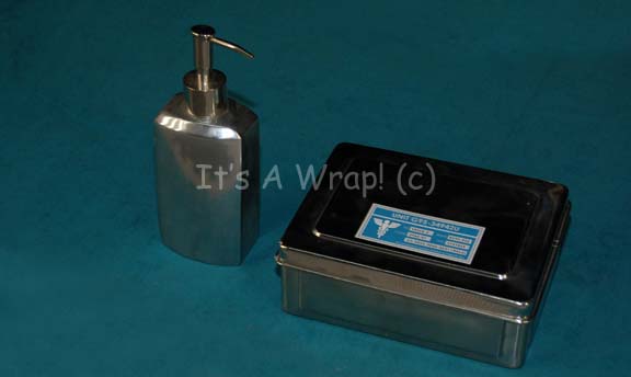 A lot of two items like those seen in sickbay in various episodes of Star Trek: Enterprise. This lot consists of a wide, polished metal, lidded box with a Starfleet inventory sticker itself featuring the medical caduceus along with several inventory numbers. In addition is a matching pump dispenser believed … |