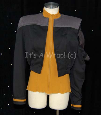 A costume element like those featured in later Star Trek feature films, Voyager episodes, and episodes of Deep Space Nine following after “Rapture”. This item is a black, Starfleet uniform jacket featuring gray, quilted shoulders, an Operations gold stripe around the cuffs, and a Velcro placement for a commbadge (sold … |
