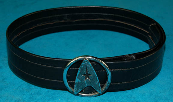 A costume accessory appearing in various Star Trek feature films and episodic television, a Starfleet crewmen's belt. The item is a black leather belt with a silver colored metal Starfleet emblem buckle with an suggested size of 31”-33”. |