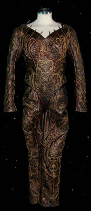 A costume featured in the Star Trek: Enterprise episode “Damage”, wherein the NX-01 experiences devastating damage. The costume was made for wear by a “Sphere Builder woman” (Josette Di Carlo) who urged the Xindi-reptillians to commence with their attack on Earth and release the superweapon. The two piece black and … |