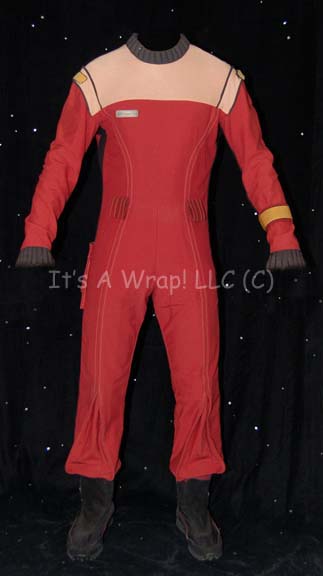 A costume style first appearing in Star Trek II: The Wrath of Kahn and continuing to be in use through the opening sequence of Star Trek: Generations. This costume consists of a long-sleeved, full-length red jumpsuit with tan shoulders, black cuff and collar ribbing, Operations gold division strips for the … |