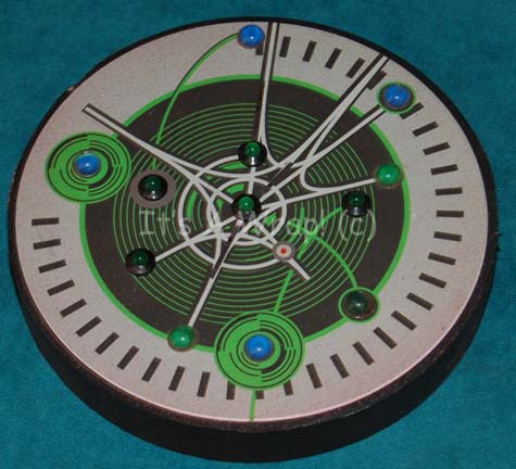 A Xindi themed console piece like those appearing variously in third season episodes of Star Trek: Enterprise on Xindi sets. The item is a fashioned wood disk with a series of embedded green colored light bulbs that activate by way of a three position switch and are powered by three … |