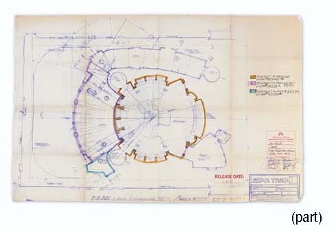A collection of approximately 10 folders of drawings and blueprints for sets in <I>Star Trek: Insurrection</I>, including: Ba'ku village, captain's yacht, transporter room, Geordi's office, Son'a scout, duck blind, collector ship and hydrothermal cavern (a lot) |