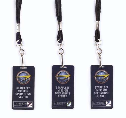 Four prop security identification badges, made of laminated cardstock with simulated "hologram" seal, one badge is labeled <I>Systems Engineer</I>, one is <I>Ground Control Officer</I>, and two are <I>Administration</I>, includes black lanyards -- worn by officials and technicians in the Starfleet Mission Control set in "First Flight" in <I>Star Trek: Enterprise</I> … |