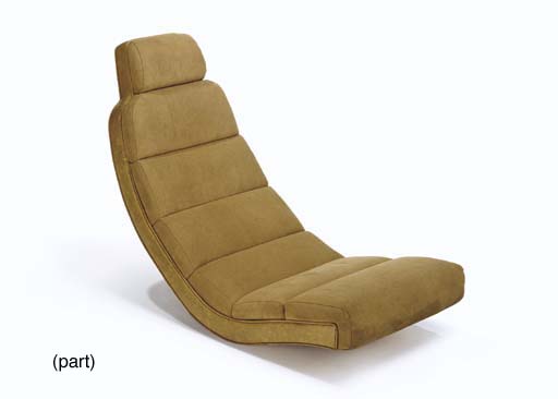 Two curved reclining chairs covered in fabric and imitation leather, without bases -- used on the <I>Enterprise-D</I> bridge set during the first season of <I>Star Trek: The Next Generation</I> for the two forward Conn and Ops control stations (2) |