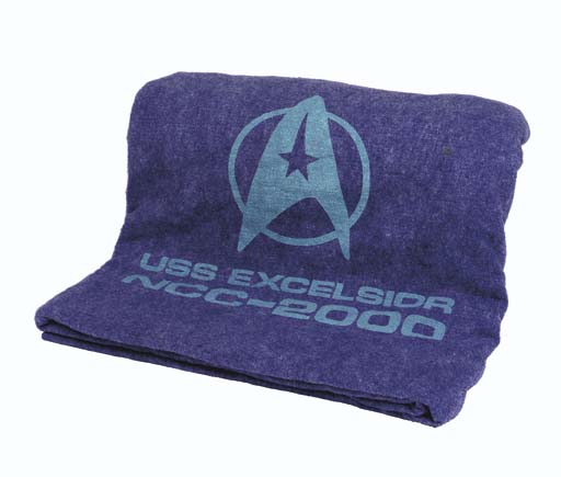 One blue blanket silkscreened in light blue at the center with the Starfleet arrowhead emblem and the words <I>USS Excelsior, NCC-2000</I> silkscreen imprint -- used in <I>Excelsior</I> crew quarters set at the beginning of <I>Star Trek VI: The Undiscovered Country</I>, when crew members are knocked out of bed by the … |