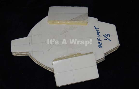 A white foam core camera test model like those used in Star Trek episodic television. The item is a representative of a “Defiant-Class” starship like those appearing variously in Star Trek: Deep Space Nine. Made from multiple layers of white foam core, the item is adhered together with remaining pencil … |