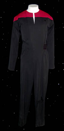 A black Starfleet uniform jumpsuit with command red shoulders worn by Avery Brooks while portraying “Commander Sisko” on Star Trek: Deep Space Nine. The costume features a form fitting elastic waistband with interior belt with clasps, a zip up the front with a clasp at the top, Velcro size adjustments … |