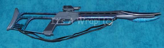 A prop energy weapon featured in Star Trek X: Nemesis for use by Reman soldiers. The item is a Reman rifle, a cast resin rifle with a metallic purple paint job, a vinyl shoulder strap, a metal double bayonet beveled and painted to appear sharp, with a trigger button that … |