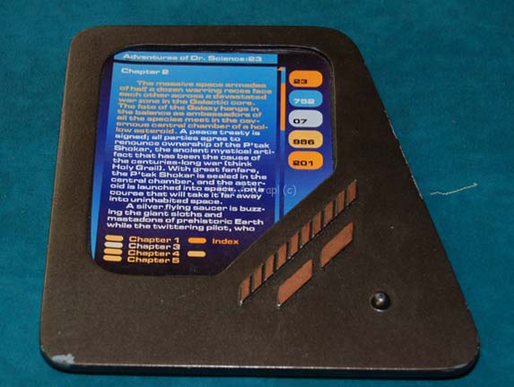 A 24th Century style Personal Access Display Device (PADD). It was presumably used on one of the 24th Century series and/or feature films including Star Trek: The Next Generation, Deep Space Nine or Voyager. The PADD is plastic painted metallic green and silver in the Romulan style however the LCARS … |