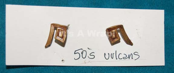 A pair of costume accents featured in the Star Trek: Enterprise episode “Carbon Creek”; wherein three Vulcans are stranded in a mid-twentieth century, Pennsylvania mining town and are forced to interact with the denizens of that town while they wait to be rescued. These items are rank pins for mid-twentieth … |
