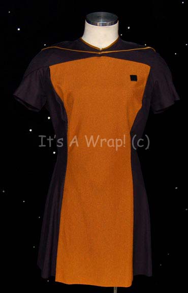 A costume featured in various episodes of Star Trek: The Next Generation. This costume is a Starfleet uniform jumpsuit and features black shoulders with an Operations Gold chest, back, sleeves, and as piping around the Mandarin collar; black waist and legs that end in stirrups, a zip down the front, … |