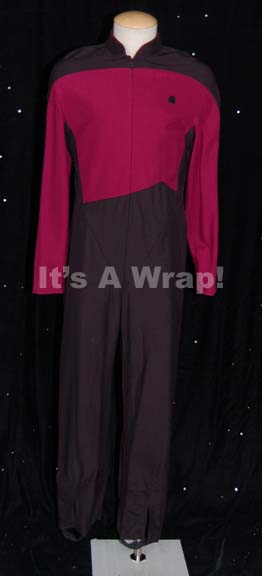 A costume featured in various episodes of Star Trek: The Next Generation. This costume is a Starfleet uniform jumpsuit featuring black shoulders, a Command Red chest, back, sleeves, and piping around the Mandarin collar; a black waist and legs that end in stirrups. This particular uniform has a zip down … |