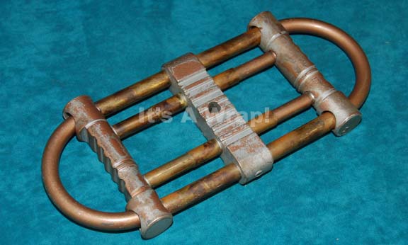 A prop of unusual high quality, the manacles worn by Patrick Stewart in his portrayal of “Captain Picard” in the Star Trek: The Next Generation episodes “Chain of Command, Parts I and II”. The item is fashioned copper colored metal with a strong central brace and two mounted bars that … |