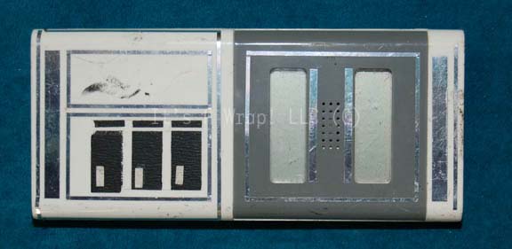 A prop LCARS (Library Computer Access and Retrieval System) button panel like those appearing in various episodes of Star Trek: The Next Generation. The item is a sheet of black acrylic with a metallic silver adhesive detail strip up the left side and a bank of distressed buttons and numeric … |