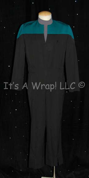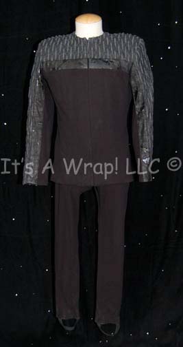 A costume featured in the Star Trek: Voyager two episode story arc “Workforce”; wherein most of the crew of “Voyager” are kidnapped, altered, brainwashed and put to work on huge industrial work force. This costume is a long-sleeved, full-length, dark-blue, reflective vinyl jumpsuit featuring pleated accents around the shoulders and … |