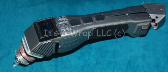 A prop believed to appear variously in episodes of Star Trek: Voyager but definitely appearing in the Star Trek: Borg Encounter 4D. the item is an injection molded plastic scanner painted metallic gunmetal with a light up sensor on the end and anon-functional display screen with a multi-colored LCARS style … |