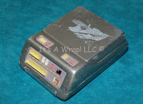 A prop tricorder like those appearing variously in episodes of Star Trek: Voyager and Deep Space Nine. The item is made from molded rubber and painted metallic pewter with multi-colored graphical applications and embedded acrylic elements. The item is molded into a highly detailed, non-opening position and depicts a degree … |