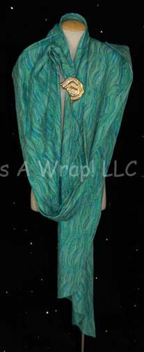 A costume element featured in the Star Trek: Voyager episode “False Profits”. This item is a sash worn by the Ferengi “Kol”, it is sea-foam green with textured, blue and green reflective accents and a gold-colored metal, stylized, Ferengi-style ear badge on the front. A costumer’s tag reads ‘Voyager, #144 … |